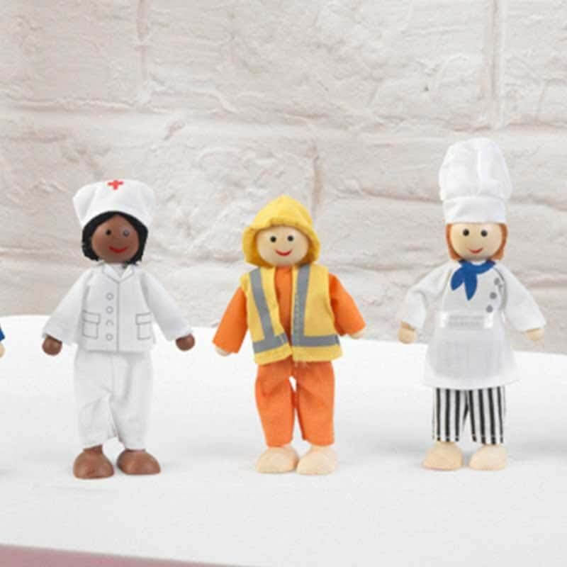 Detta set har inspiration från olika yrken och varje docka har sitt yrke med kläder utifrån det. Här finns bland annat brandman, läkare, polis och en kock, dockorna är gjorda av trä men har böjbara armar och ben. Superfina dockor för fantasifulla lekar.
