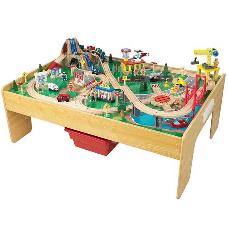 KidKraft Adventure Town train Set Aktivitetsbord, det här fantastiska aktivitetsbordet bjuder barnen på timmar av roligheter och massor av lekmöjligheter. Hela 120 delar av tågbanor, fordon, hus och figurer ingår, däribland ett berg med tunnlar, brand och polisstation, lyftkran och helikopterplatta. Bordsskivan är målad som ett fint grönlandskap med en sjö och väg, en bra grund att bygga upp banorna och leklandskapet på. Det är bara att bygga upp allt och låta leken börja, när det är dags att avsluta så finns det två praktiska förvaringslådor under bordet där alla delarna kan läggas.