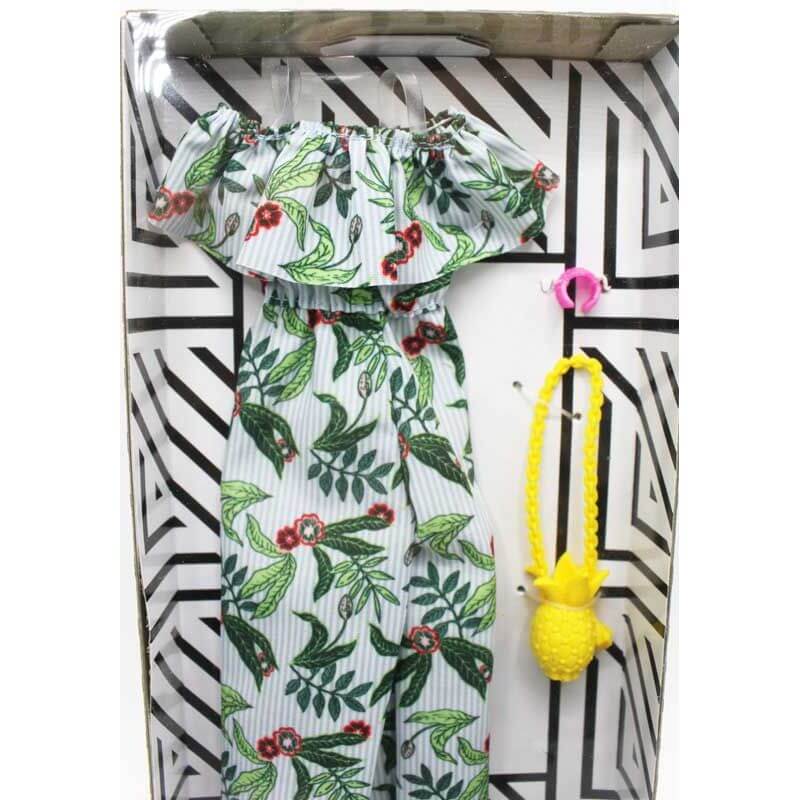 Barbie Fashion Klädset, härliga sommarplagg och tillbehör till barnens Barbiedockor. Med dessa kläder blir dockans garderob komplett kan vi lova, i setet får man en superfint byxdress med volanger vid axlarna och ett härligt blad och blommönster, till det ingår ett vitt armband och en riktigt rolig väska som ser ut som en ananas. Superfina kläder som man med fördel kan mixa och matcha med andra plagg för att skapa en unik stil till sin Barbiedocka.