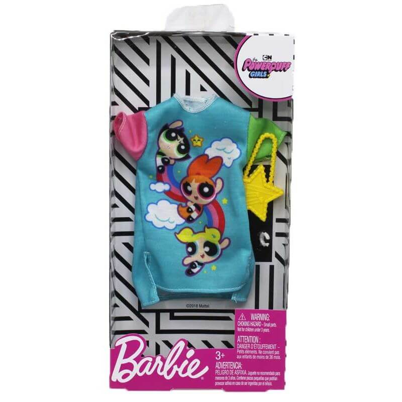 Barbie Fashion Klädset, ett trevligt klädset till barnens Babriedockor som har inspiration från serien powerpuffpinglorna. I setet får man T-shirtklänning i blått, rosa och grönt med de tre powerpuffpinglorna på, ett vitt armband ingår också samt en gul stjärnformad väska att matcha till. En riktigt härlig och färgglag outfit som kommer passa perfekt in i barbies garderob.