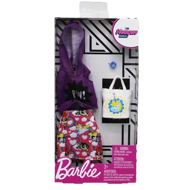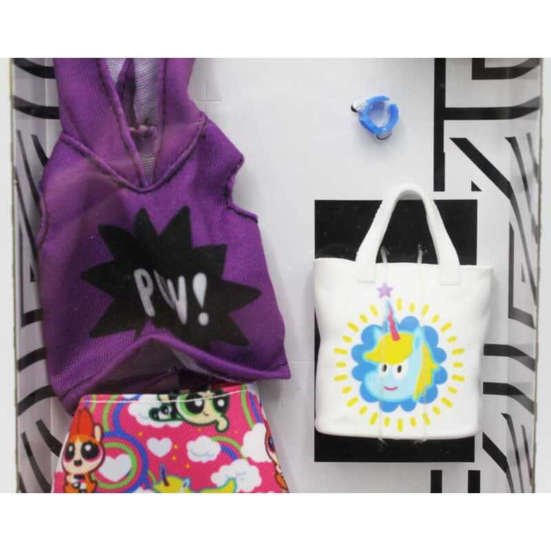 Barbie Fashion Klädset, ett superfint klädset till barnens Barbiedocka. Kläderna och tillbehören i detta set har inspiration från serien powerpuffpinglorna och här ingår en ärmlös, lila huvtröja med text på, en rosa kjol med pinglorna, enhörningar och andra fina tryck på samt en väska och en klocka.