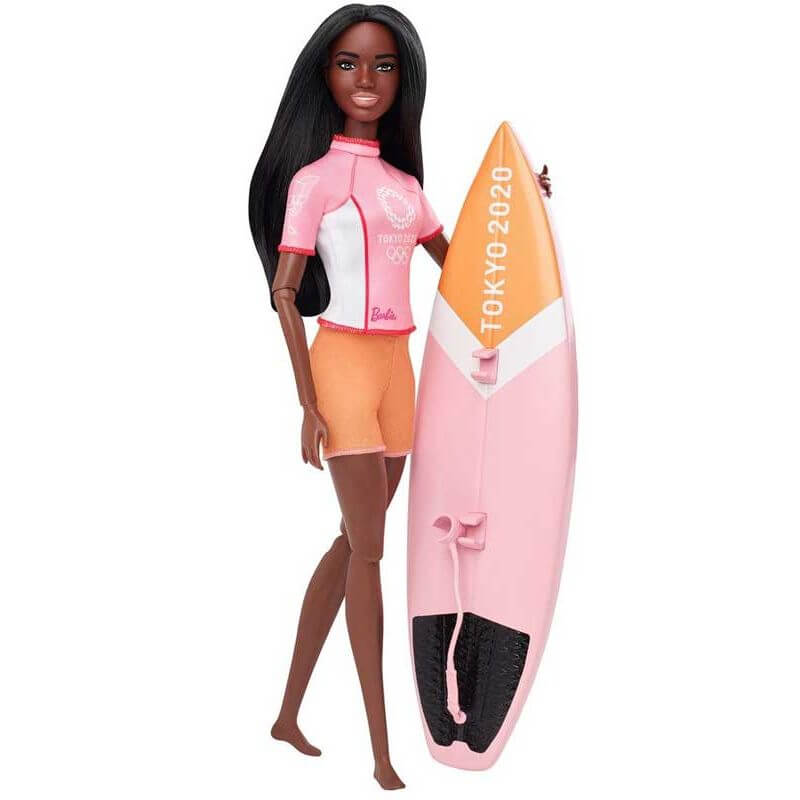 Barbie Olympics Surfing Docka, oj oj så härligt, Barbie ska ut och surfa. Hon tränar ofta nu för tiden, för att hon ska delta i Olympicstävlingarna. Hon är jätteduktig och har en vacker surfingbräda och passande klädsel. Höjd: 30 cm.