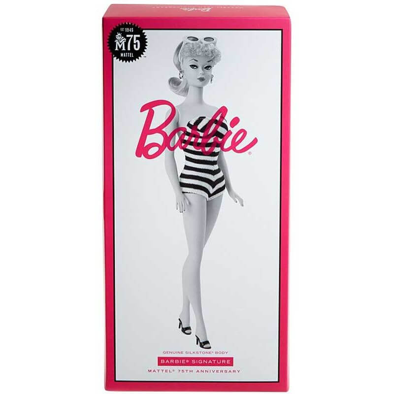 Barbie Signature Docka 75th Anniversary Silkstone Collection, Nu firar Barbie Mattels 75-årsjubileum med en nyproduktion av den här vackra dockan från 1959. Med inspiration från dockan som från början startade allt kommer nu den här med samma vintage baddräkt och originalansiktet. Höjd: 28,5 cm.