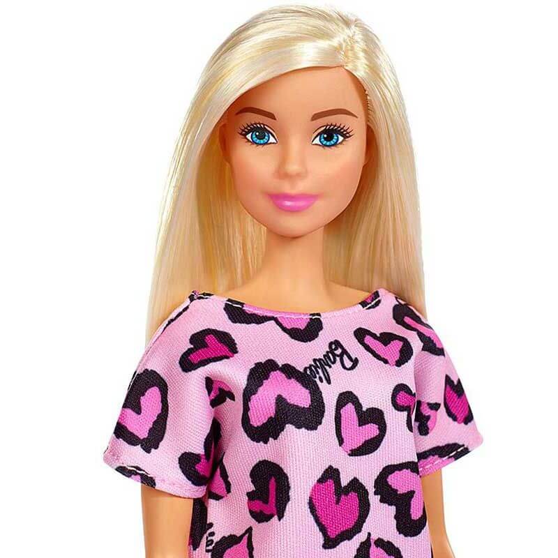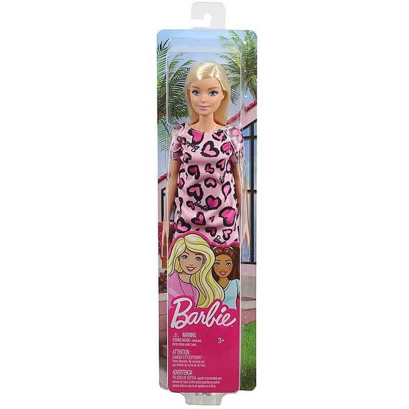 En superfin Barbiedocka med långt ljus hår och blå ögon. Hon är klädd i en härlig rosa klänning med hjärtan på, till klänningen har hon ett par vita platåskor. Höjd: 29 cm.