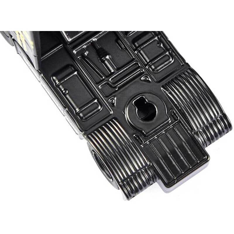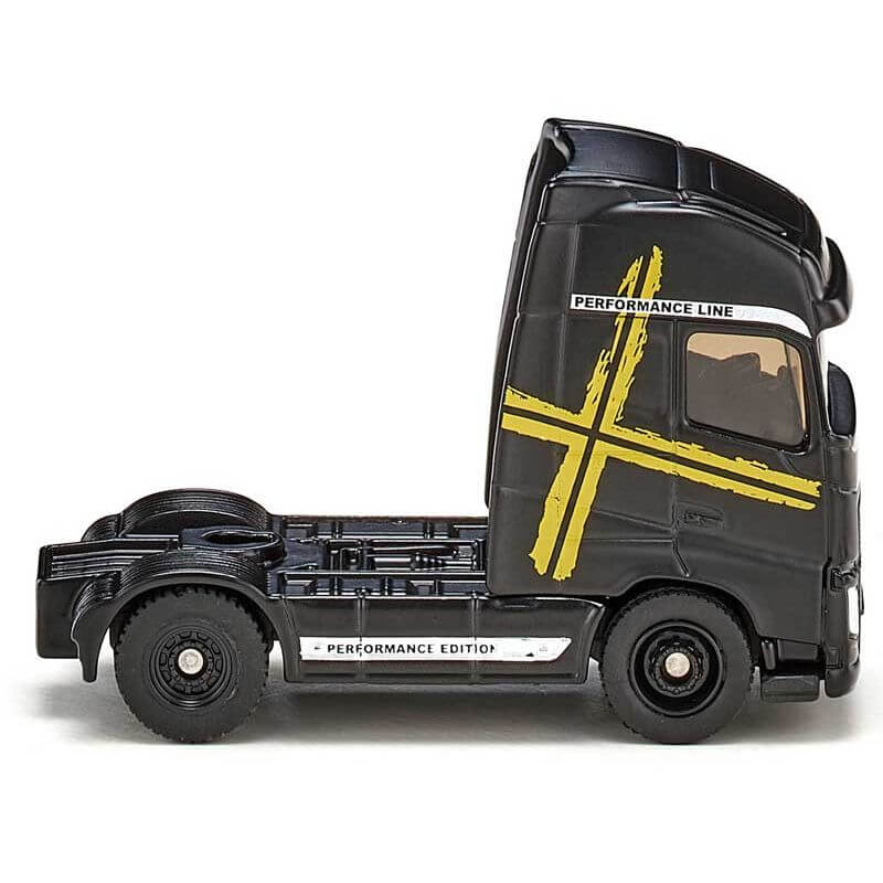 Denna fina lastbil är tillverkad i metall med vissa stöttåliga plastdetaljer. Den är så snygg i svart med gult målat på hytten och texten "Performance line".