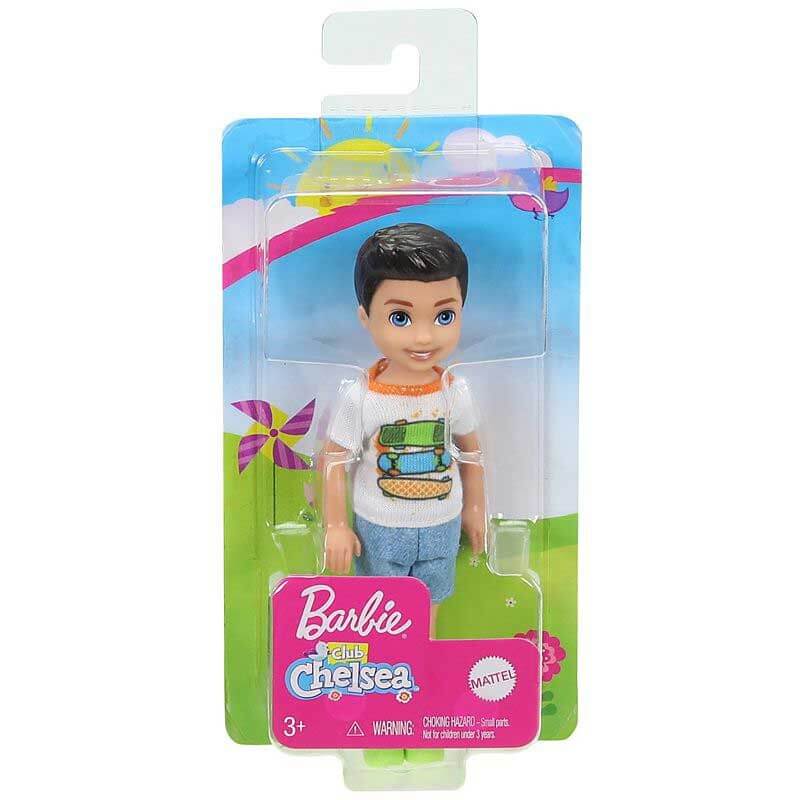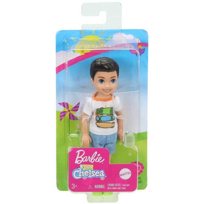 Barbie Chelsea Club Pojkdocka, en jättefin docka med mörkt hår och blå ögon för barnen att leka med. Han bär en vit T-shirt med skateboards på till ett par blå shorts och gröna sneakers.