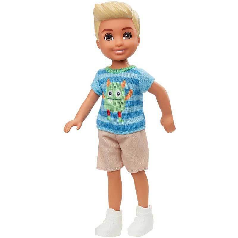 Barbie Chelsea Club Pojkdocka, en superfin docka med ljust hår och bruna ögon för barnen att leka med. Han bär en blå och grönrandig T-shirt med ett monster på till ett par beiga shorts och blå sneakers.