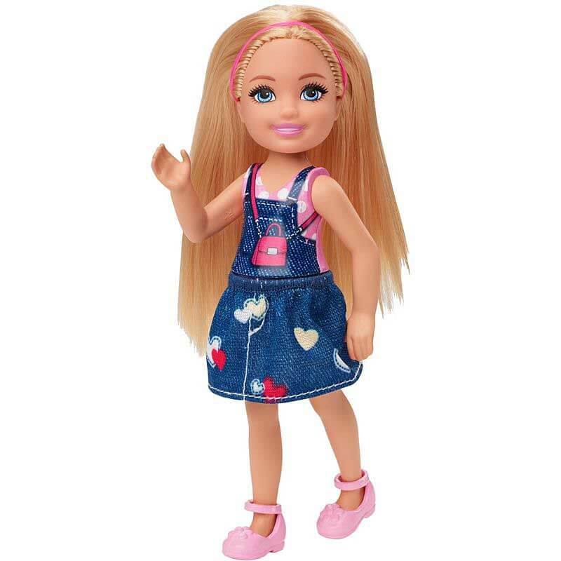 Barbie Chelsea Club, en superfin Chelseadocka med ljust hår och blå ögon. Chelsea bär en rosa topp med vita prickar under en blå hängselkjol med söta så hjärtan på. Till det har hon ett par rosa sandaler och ett matchande rosa hårband. Höjd docka: 14 cm.