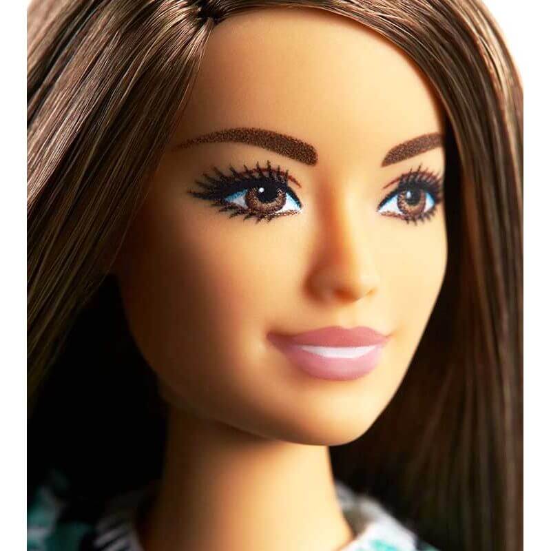 Just den här fina dockan är lite kurvigare än originalet och hon har långt brunt hår i en rak frisyr.