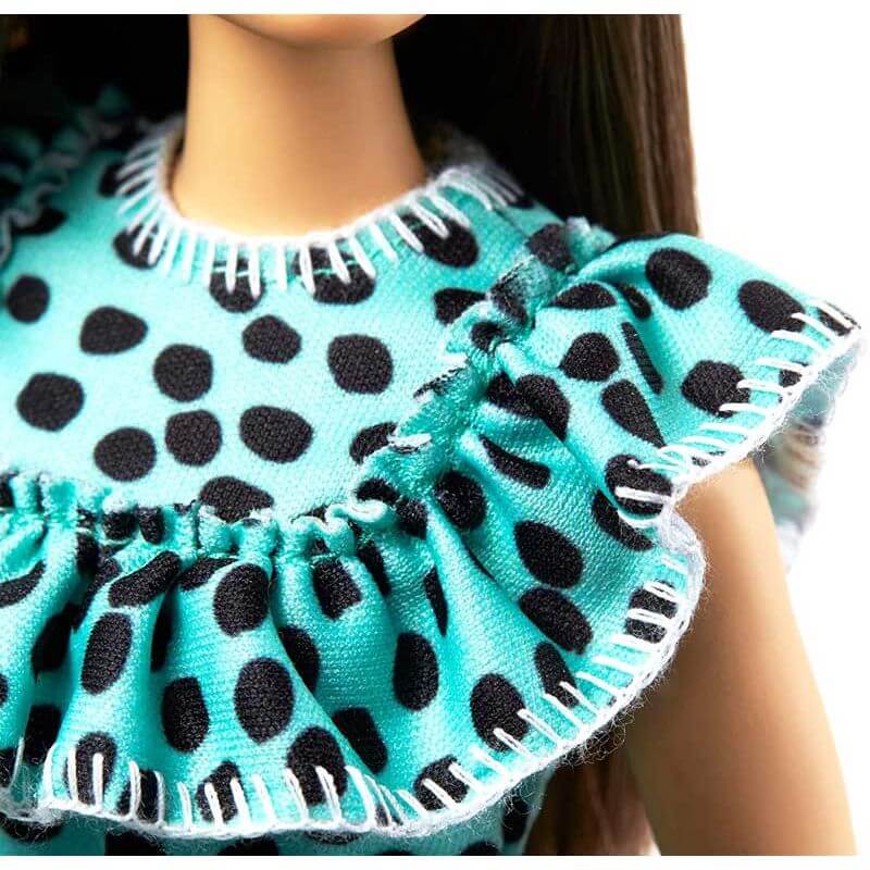 Barbiedocka Fashionistas med grön klänning med prickar, en superfin docka från den populära Fashionistas serien som barnen kan leka med. Dockorna i den här serien kommer i 5 olika kroppstyper, 10 hudtoner, 8 ögonfärger och 19 olika hårfärger och frisyrer. Mångfalden hos dockorna speglar vår verkliga värld där alla är olika. Höjd: 29 cm.