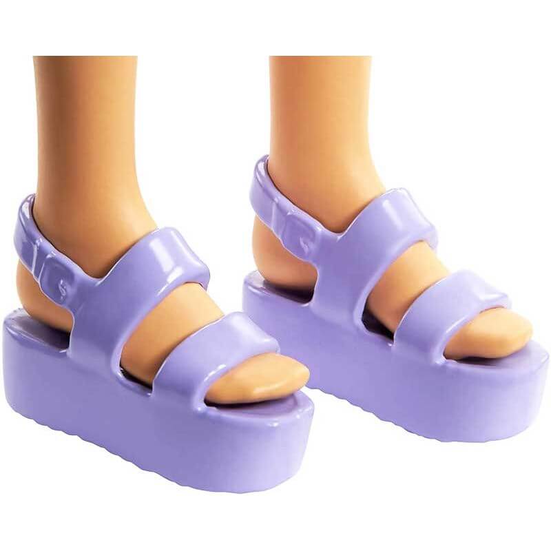 Dockan bär en fin grön klänning med svarta prickar och volanger på och till det har hon ett par lila sandaler, en superfin docka som barnen kommer ha mycket roligt med.