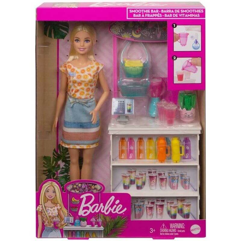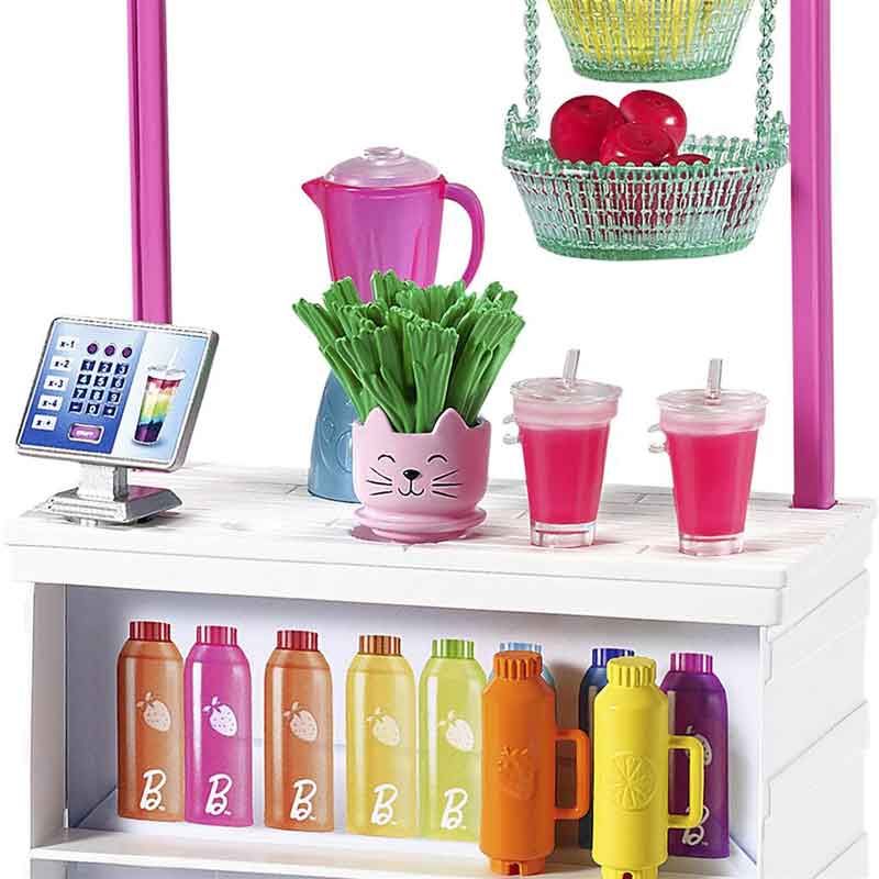 Det ingår bland annat en mixer, två smoothiemuggar, två juiceflaskor, hängande korgar för förvaring av ingredienser, kassadator och så klart ett försäljningsstånd där Barbie kan sälja sina godsaker.
