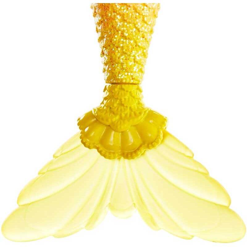 Dockan har långt gult hår som matchar den lika gula fenan som även är smyckad med glitter och blå detaljer i midjan. Även dockans topp är gul med blå axelband och på huvudet bär hon en blå tiara som matchar fint.