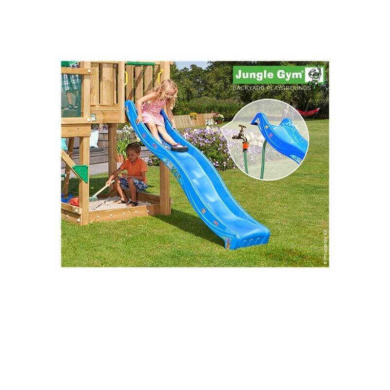Det finns möjlighet att ansluta en vattenslang, så att rutschkanan på ett ögonblick kan förvandlas till en vattenrutschkana.