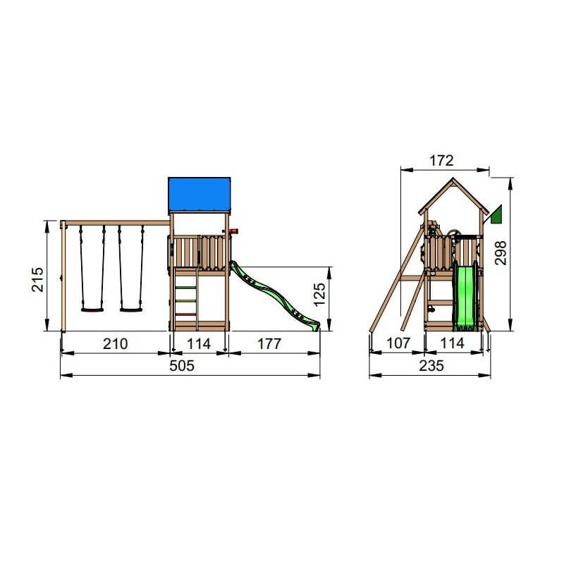 Inklusive 3-stegsstege, jordankare, borr/skruvar, beslag, skruvskydd, handtag, stjärnkikare, ratt, Jungle Gym-flagga, huvudskydd, grön rutschkana 220 cm och sandlåda.