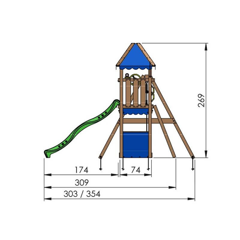 Inkluderar trestegsstege, jordankare, borr/skruvar, beslag, skruvskydd, handtag, presenningtak, StarOscope™ (Teleskop), Jungle Steering Wheel™ (ratt), Jungle Gym flagga, minimarknad, gungställning med en gunga och en trapetsgunga, blå rutschkana 220 cm, huvudskydd, sandlåda och manual.