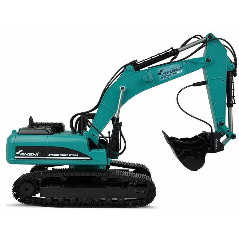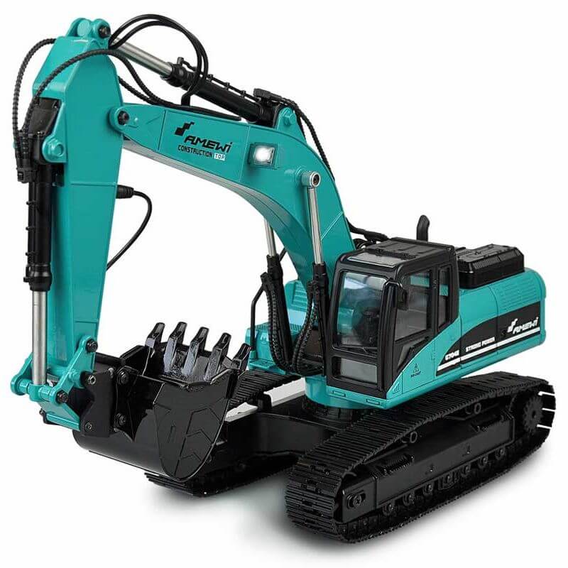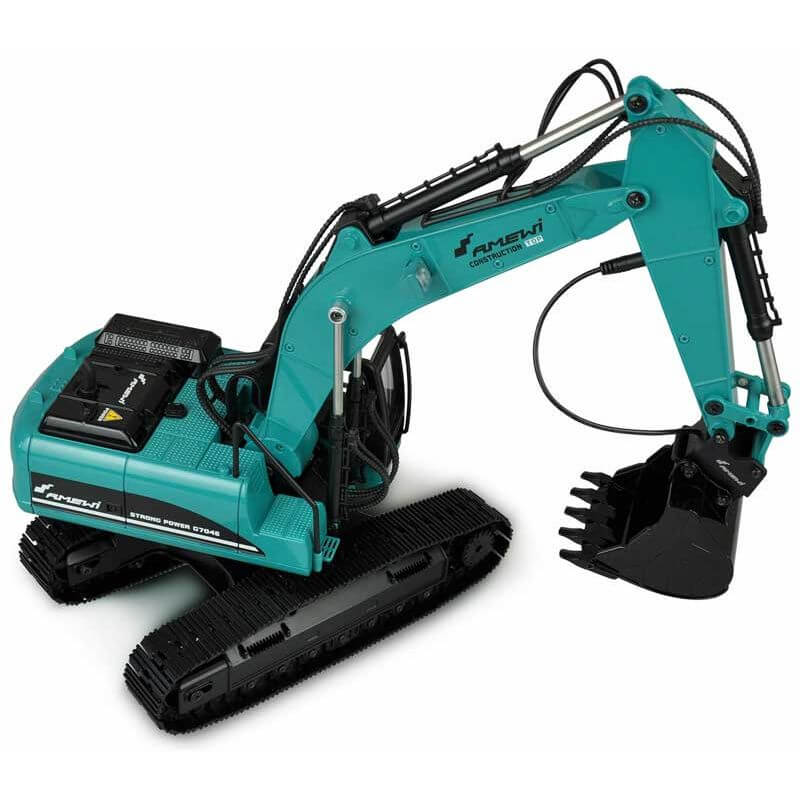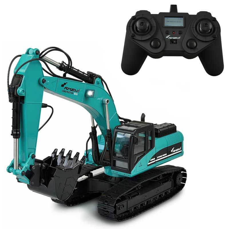 - Denna grävmaskin är starkare än de radiostyrda grävmaskinerna Amewi ACV730, Liebherr från Jamara och Volvo från Play Fun.