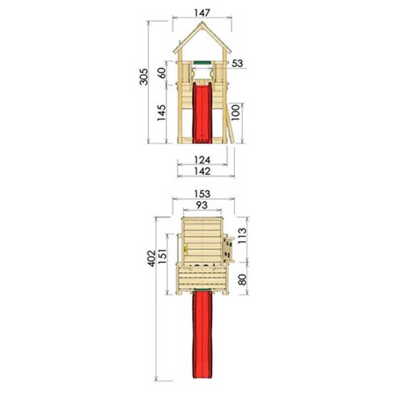 Balkongen ger en fantastisk utsikt, och ratten ger ytterligare möjlighet för aktiv lek. I botten av lektornet finns en sandlåda som är placerad i skuggan och där vackra sandslott kan ta form. Lektornet kan med fördel byggas ut med Climb eller Swing Modul x'tra eller en av de andra roliga och finurliga modulerna i Jungle Gym-serien, så att platsen i trädgården kan utnyttjas till max och det skapas plats för många timmars härlig lek.