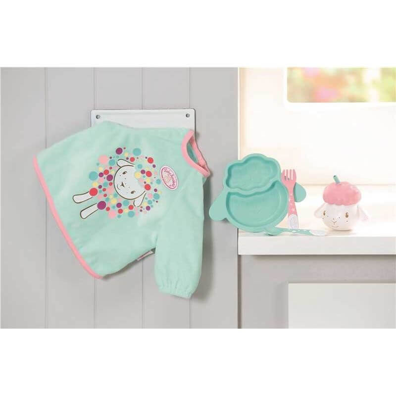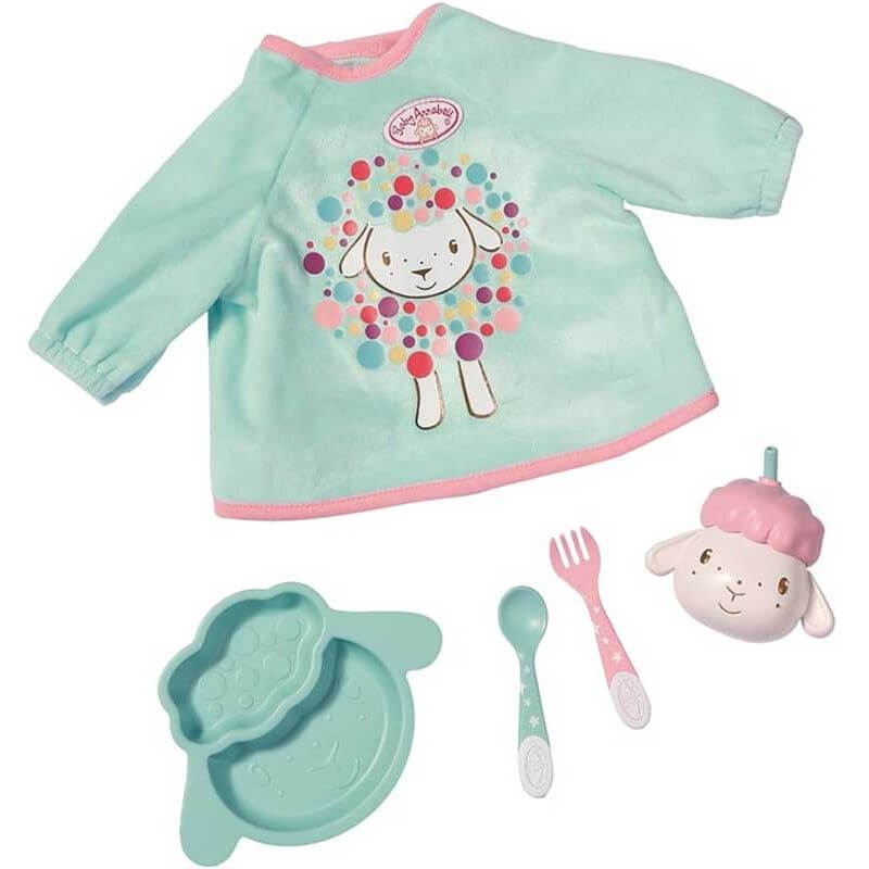Här ingår nämligen alt som behövs inför matstunden inklusive en söt tröja som skyddar dockans kläder från matkladd och spill.