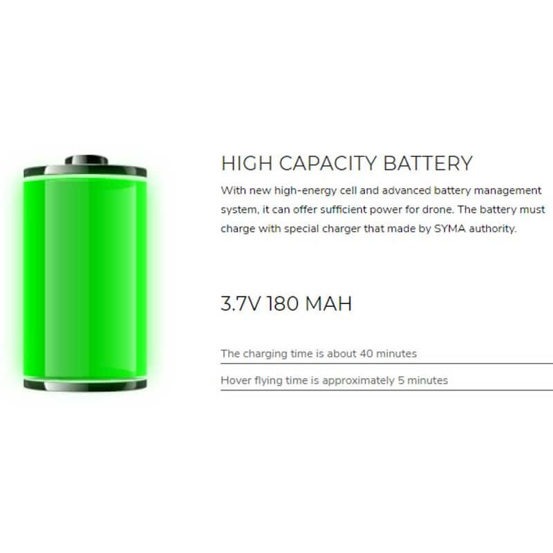 - Drönare: Det ingår ett uppladdningsbart batteri Li-poly 3,7 volt, 180 mAh.