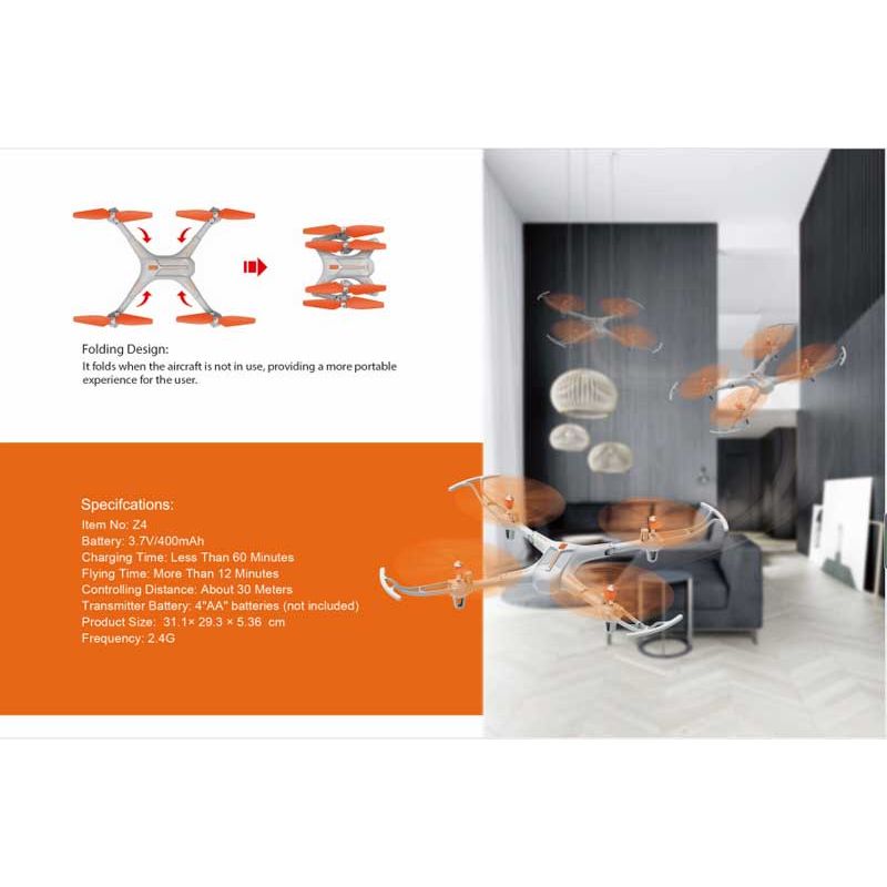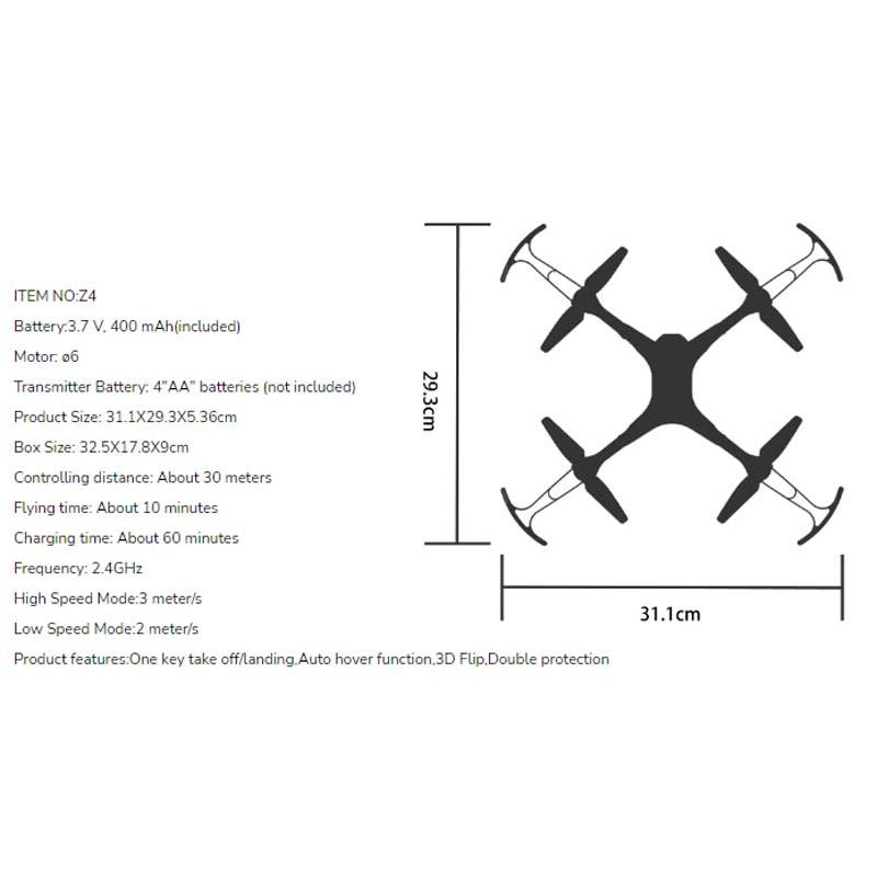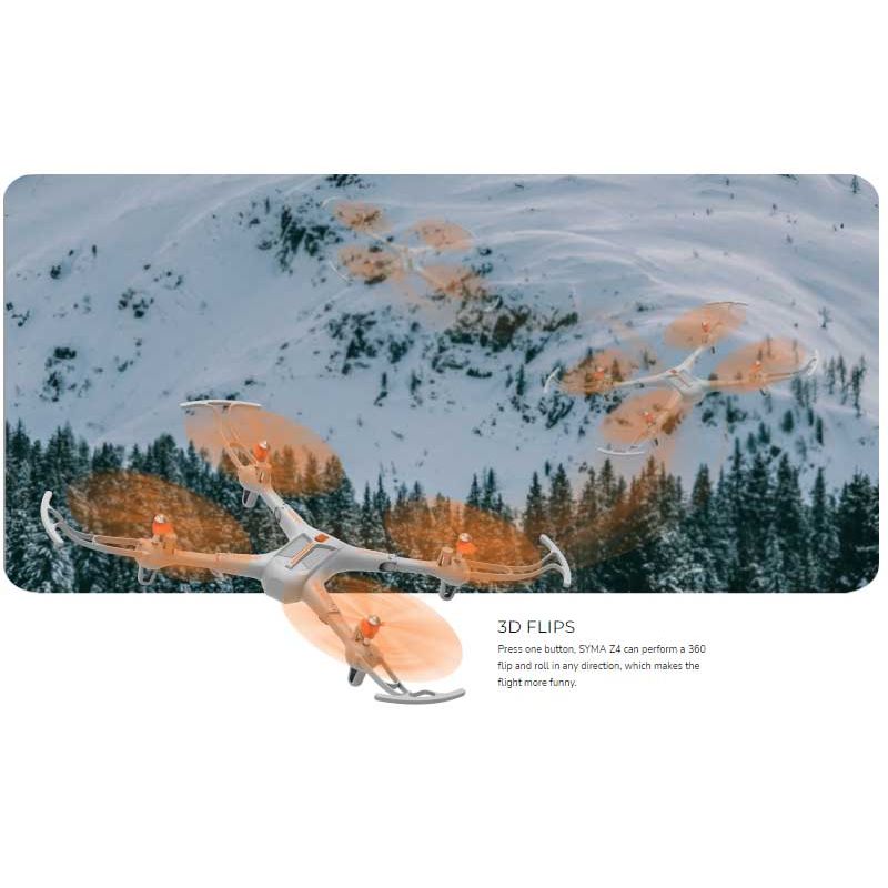 Syma Drönare Z4 Storm med 2,4 Ghz styrning. Den har också en knapp för automatisk start och automatisk landning. Den har även auto-hovering, vilket innebär att den kan sväva på önskad höjd. Längd 28,5 cm. Bredd: 26 cm. Utgått, se andra radiostyrda leksaker, klicka här.