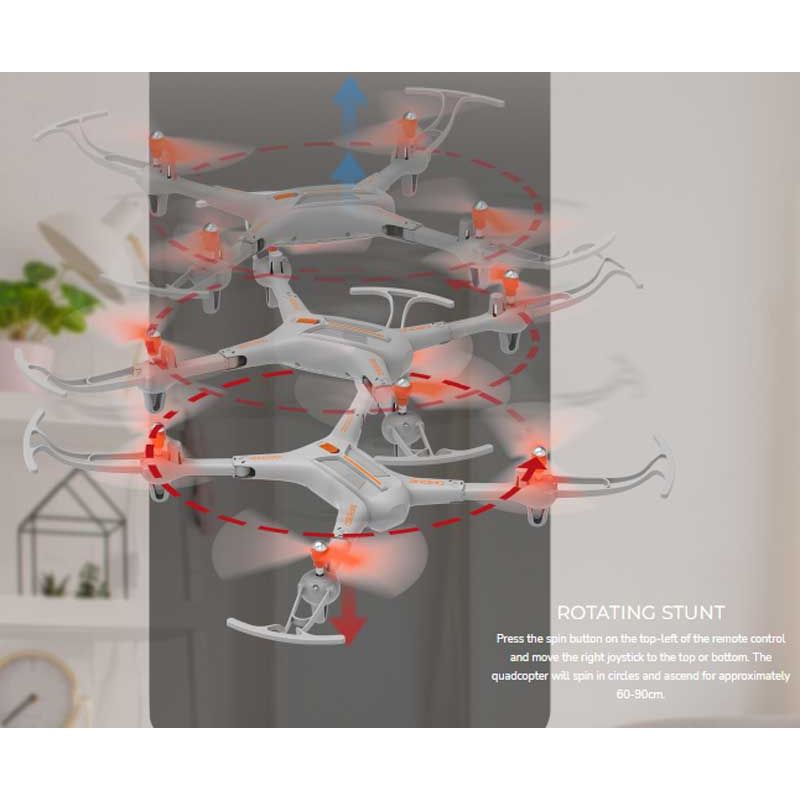 Den har också auto-hovering, vilket innebär att den kan sväva på önskad höjd, den kan göra 360 flips i luften och flyga i cirklar.