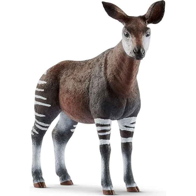 Schleich Okapi 14830, Schleich -figurerna är alla framtagna med hänsyn till minsta detalj och uppmuntrar barn att leka och lära sig samtidigt. Okapin är ett litet giraffdjur som lever i skogen. Särskilt iögonfallande är den randiga pälsen på bakbenen, som liknar en zebras. Längd: 11 cm