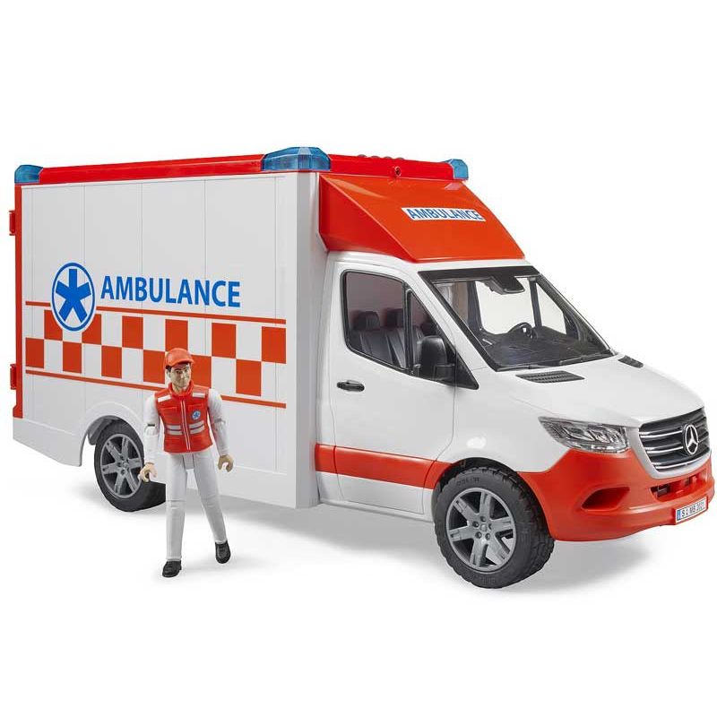 Bruder Ambulans Mercedes Benz Sprinter med figur 02676, nu kan barnen leka att de ger sig ut och hjälper folk i nöd. Med denna fina ambulansbil är man redo för nästa räddningsuppdrag.