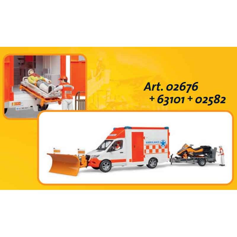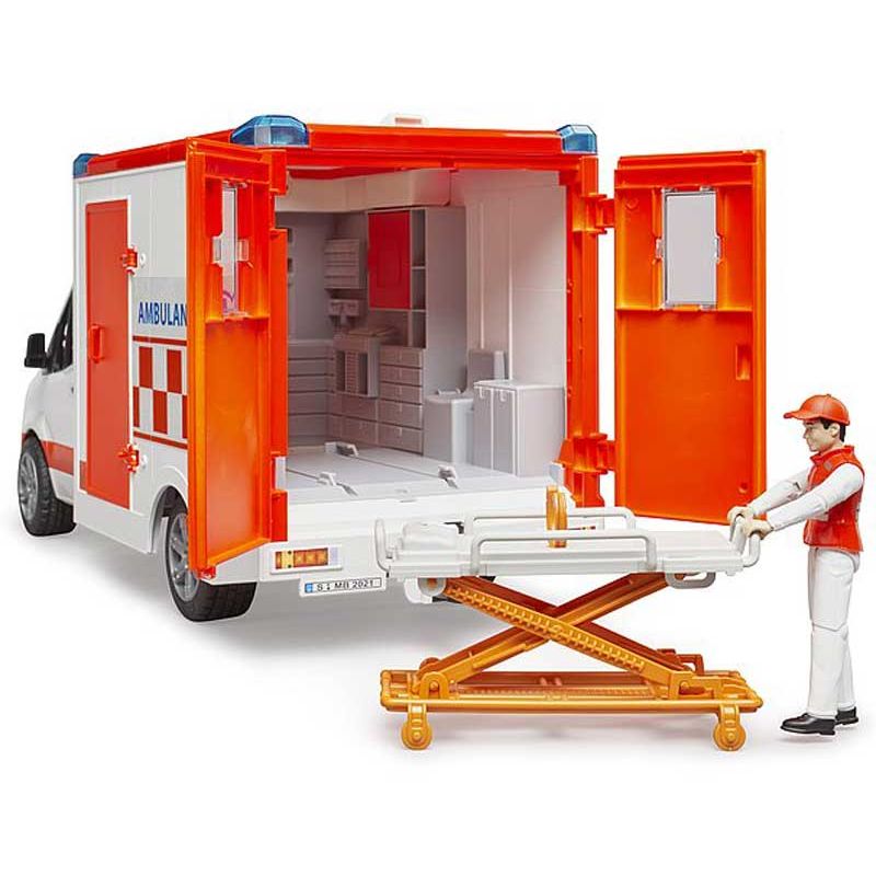 Bruder Ambulans Mercedes Sprinter med figur 02676, en superfin leksaksbil och ambulans med förare och vårdare från bruder. Nu kan barnen leka att de rycker ut för att hjälpa människor i nöd. Bakdörrarna och framdörrarna kan öppnas, det ingår även bår. Skala: 1:16. Längd: 45 cm.