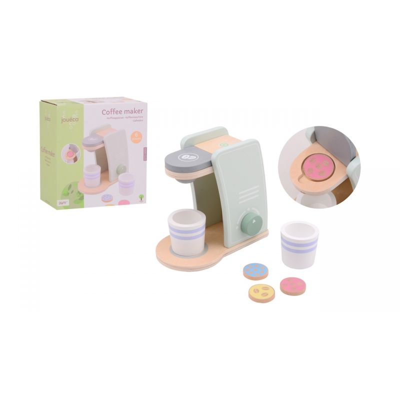 Starta dagen med en kopp lekfullt kaffe! Denna charmiga kaffemaskin i trä bjuder in barnen till härlig roll-lek där de kan brygga, servera och leka café – precis som de vuxna.