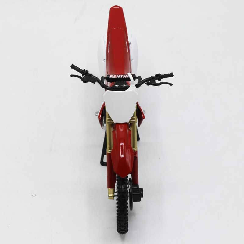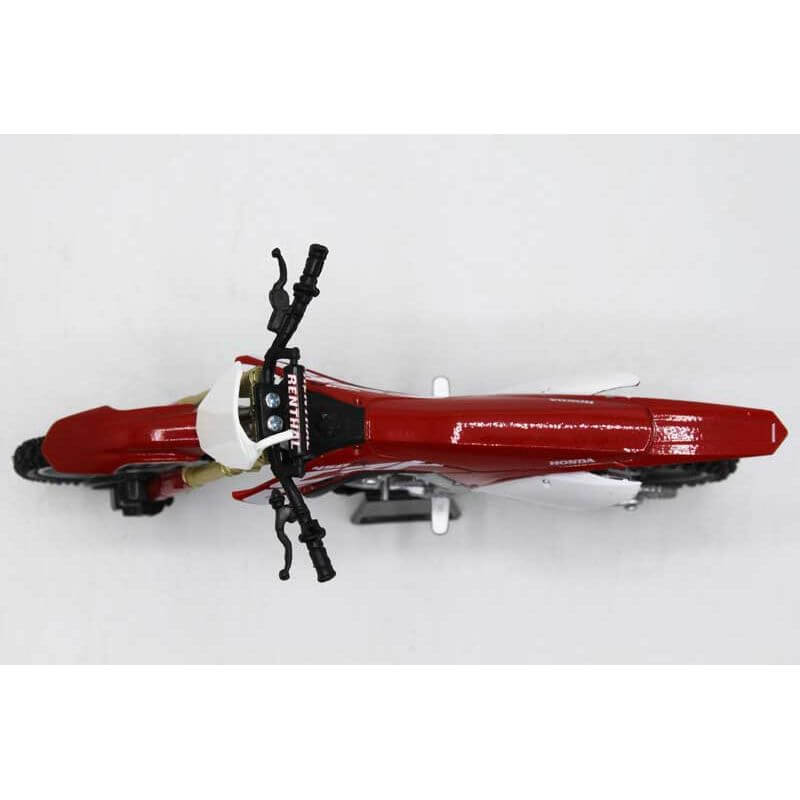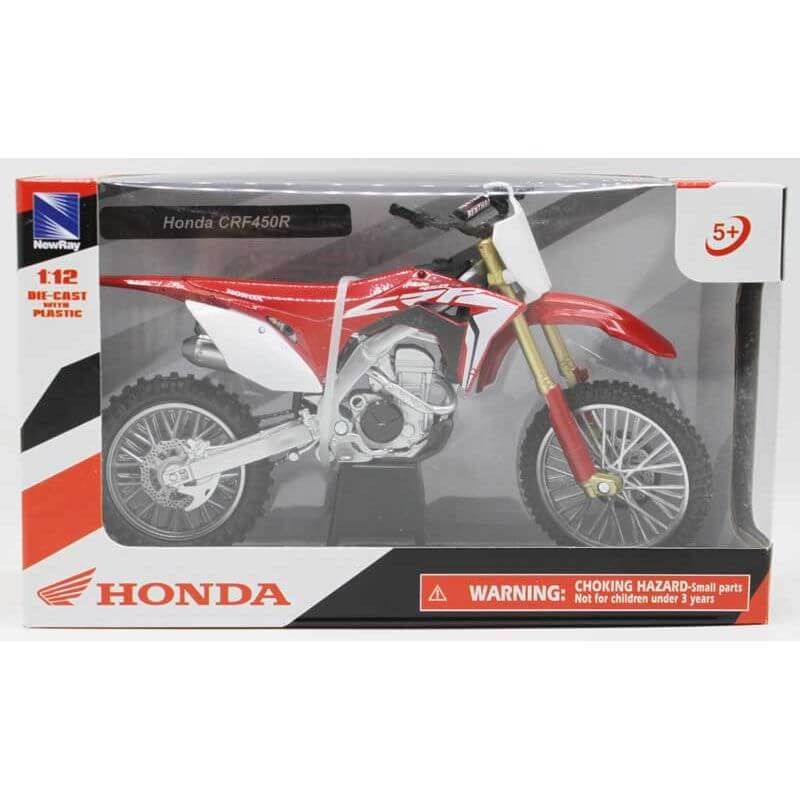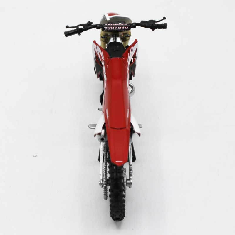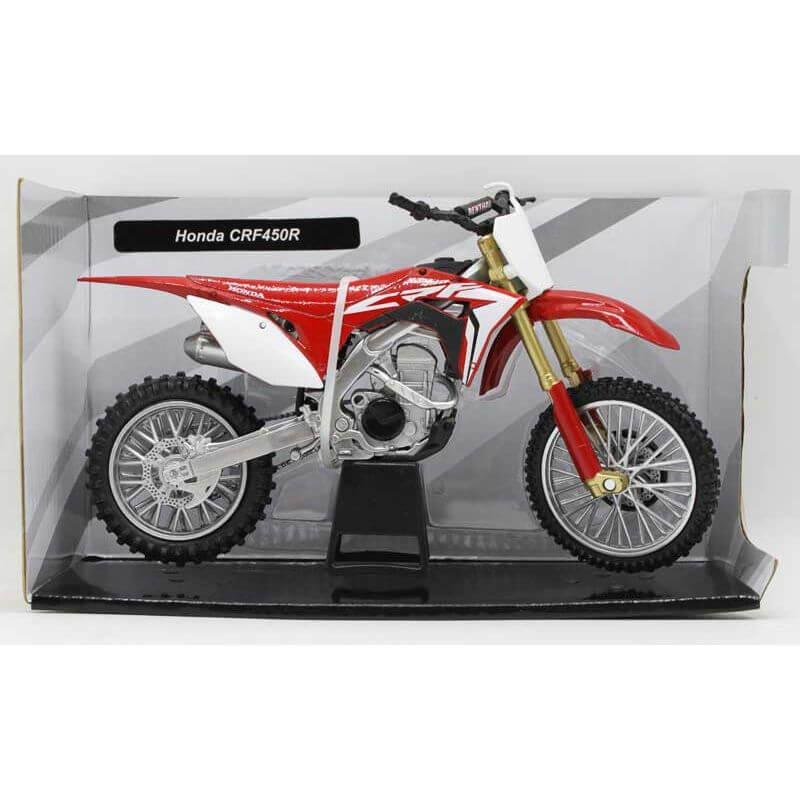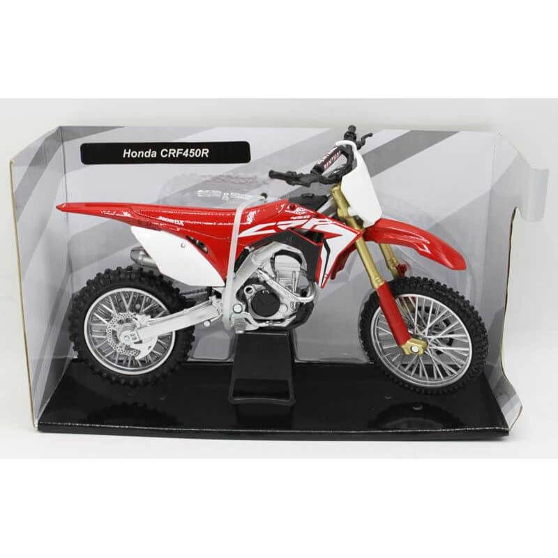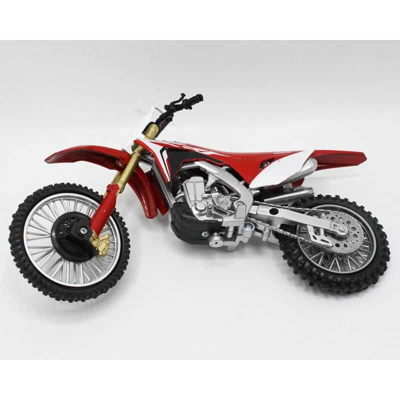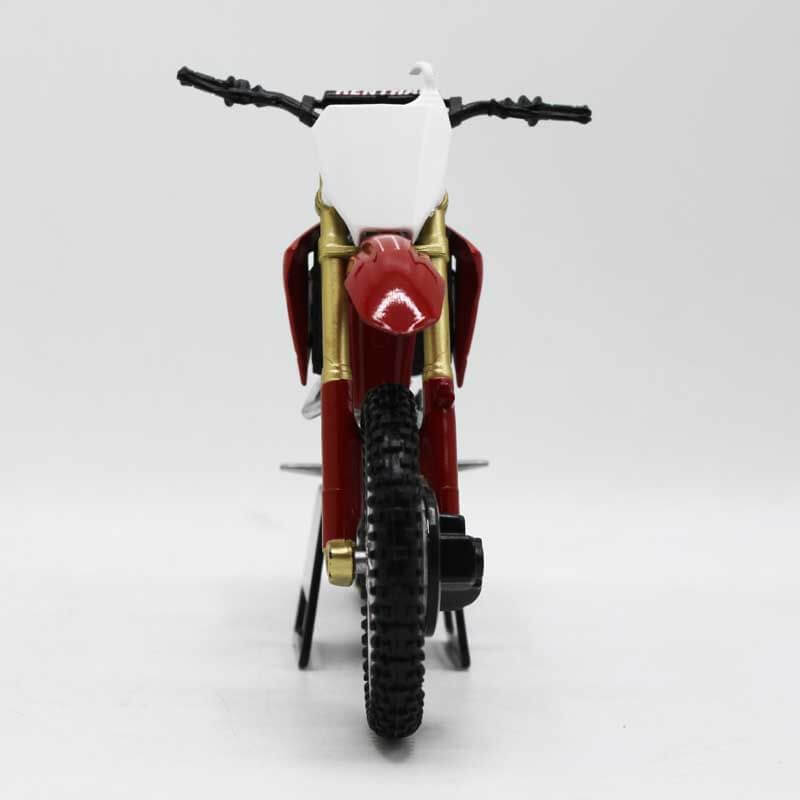 Motocross Honda CRF450R Lekaksmotorcykel som leksak till barn, en superfin lekakscross att leka med både inomhus och utomhus. Det är en Die-Cast motorcykel, i metall och plast. Motorcykeln köps så klart även för att ha den som samlarmodell i hyllan. Skala: 1:12. Längd: 18 cm.