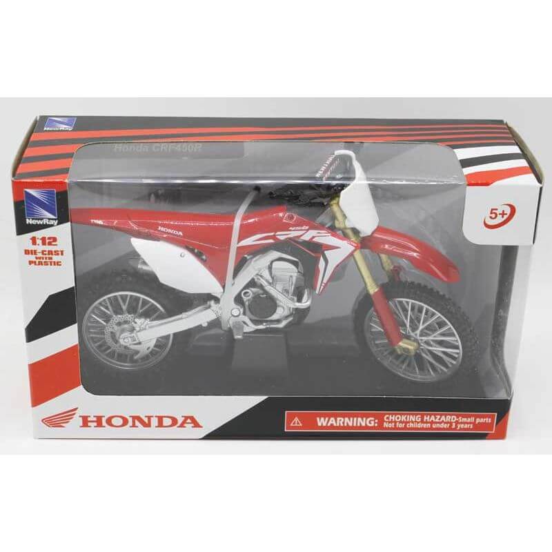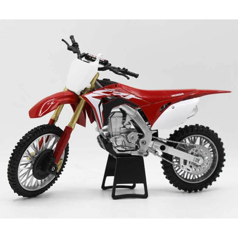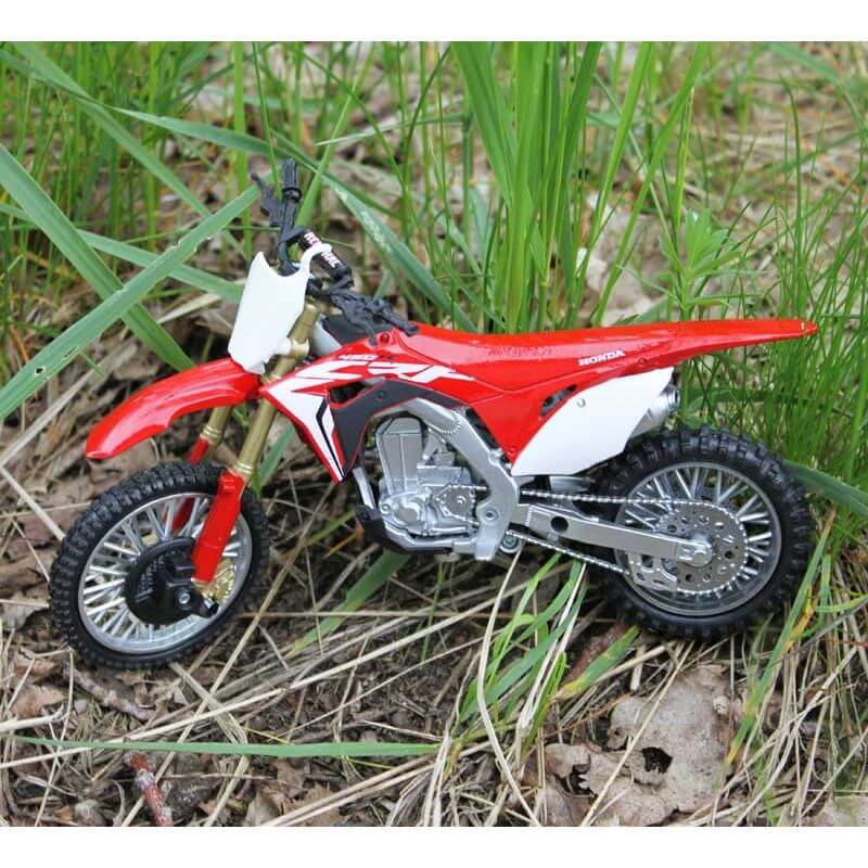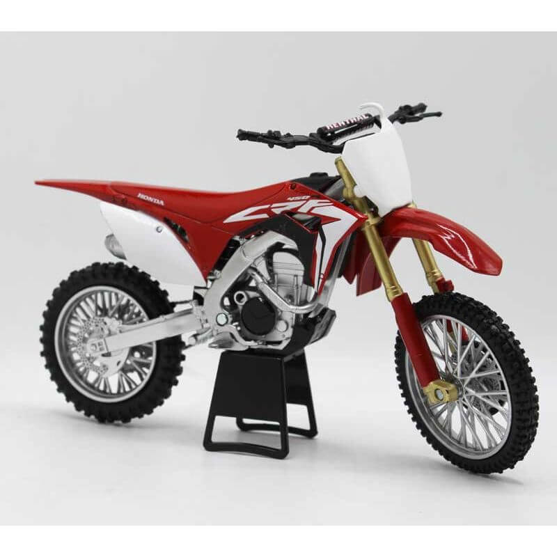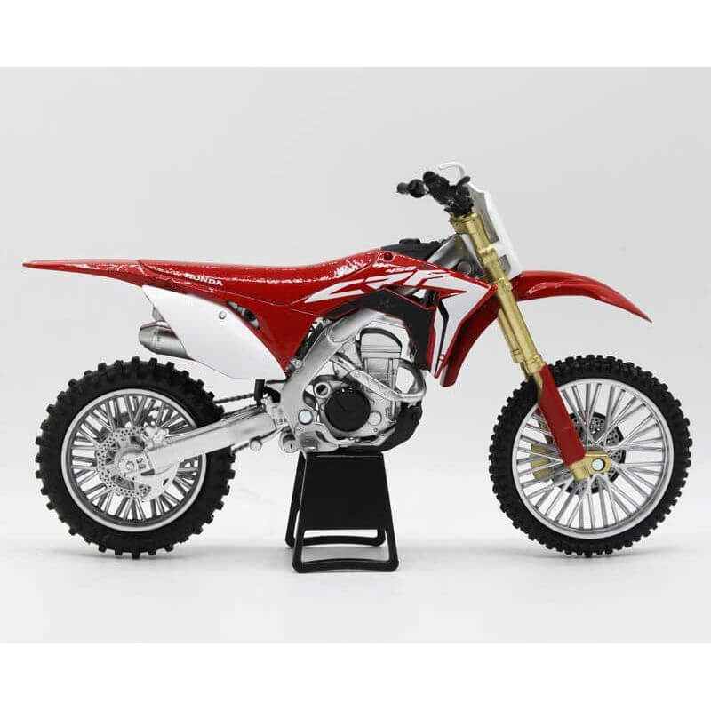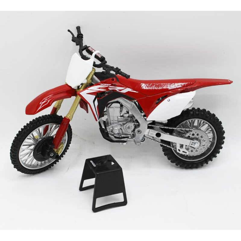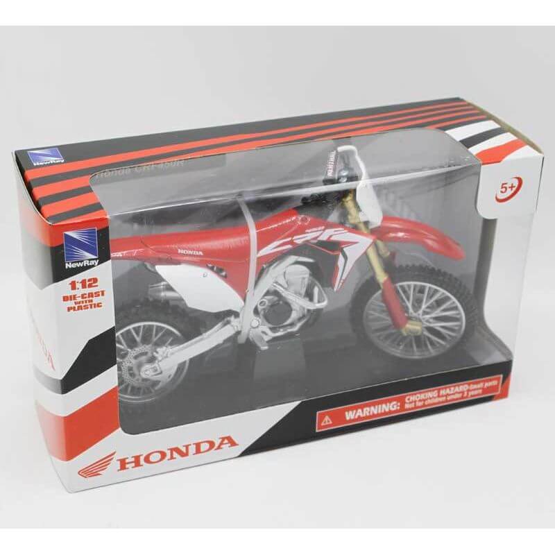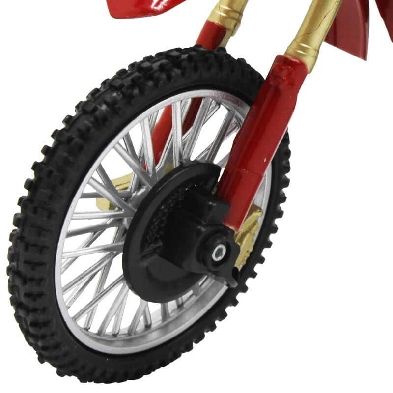Motocross Honda CRF450R Lekaksmotorcykel som leksak till barn, en superfin lekakscross att leka med både inomhus och utomhus. Det är en Die-Cast motorcykel, i metall och plast. Motorcykeln köps så klart även för att ha den som samlarmodell i hyllan. Skala: 1:12. Längd: 18 cm.
