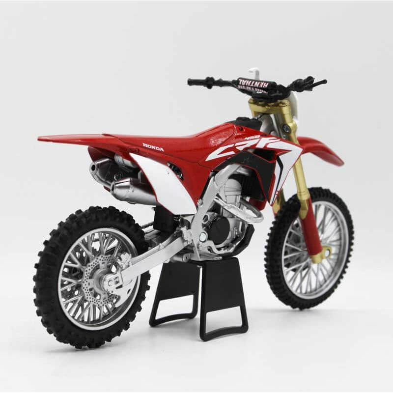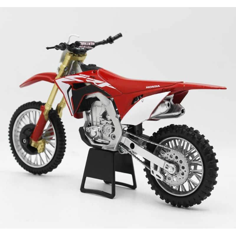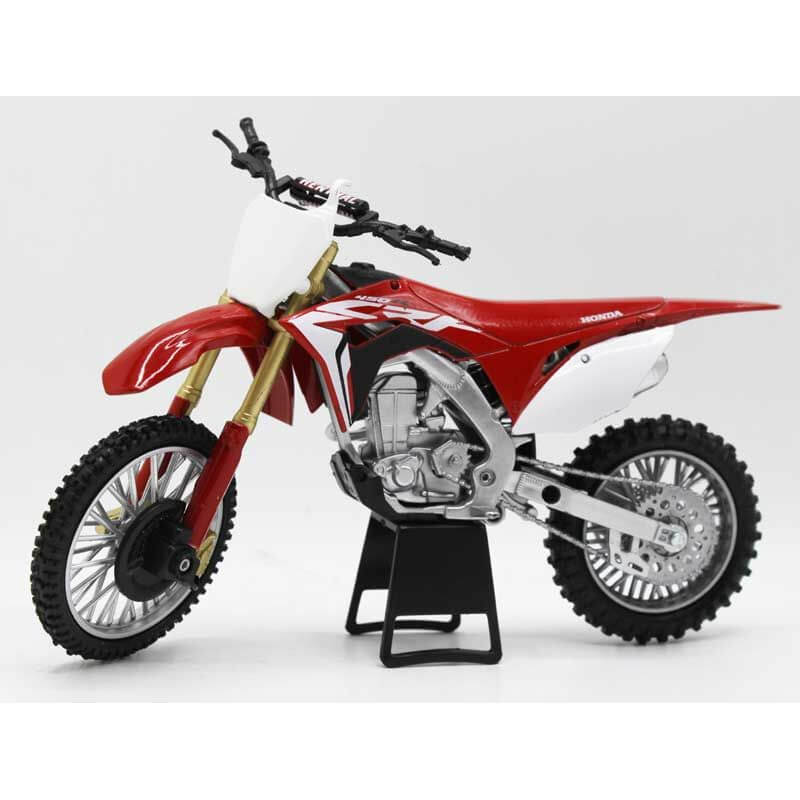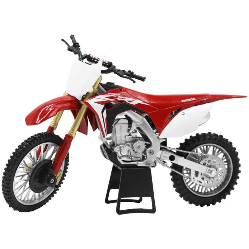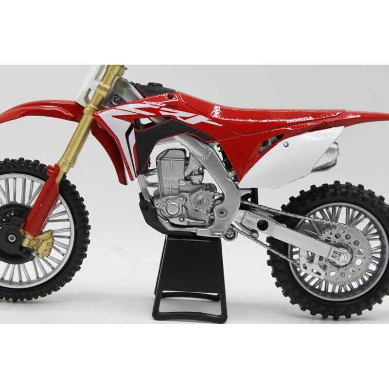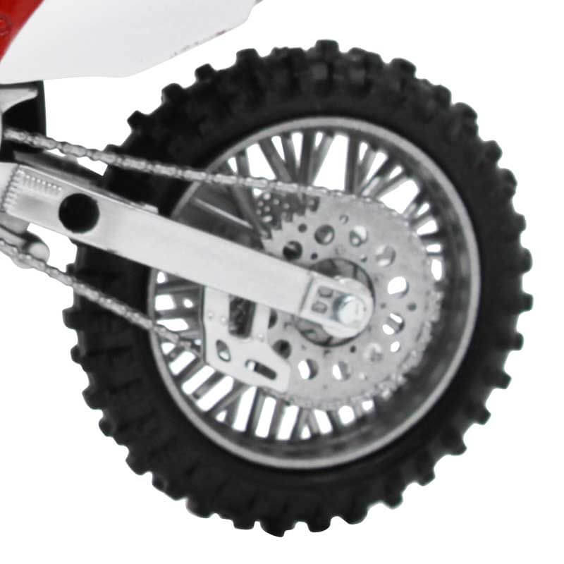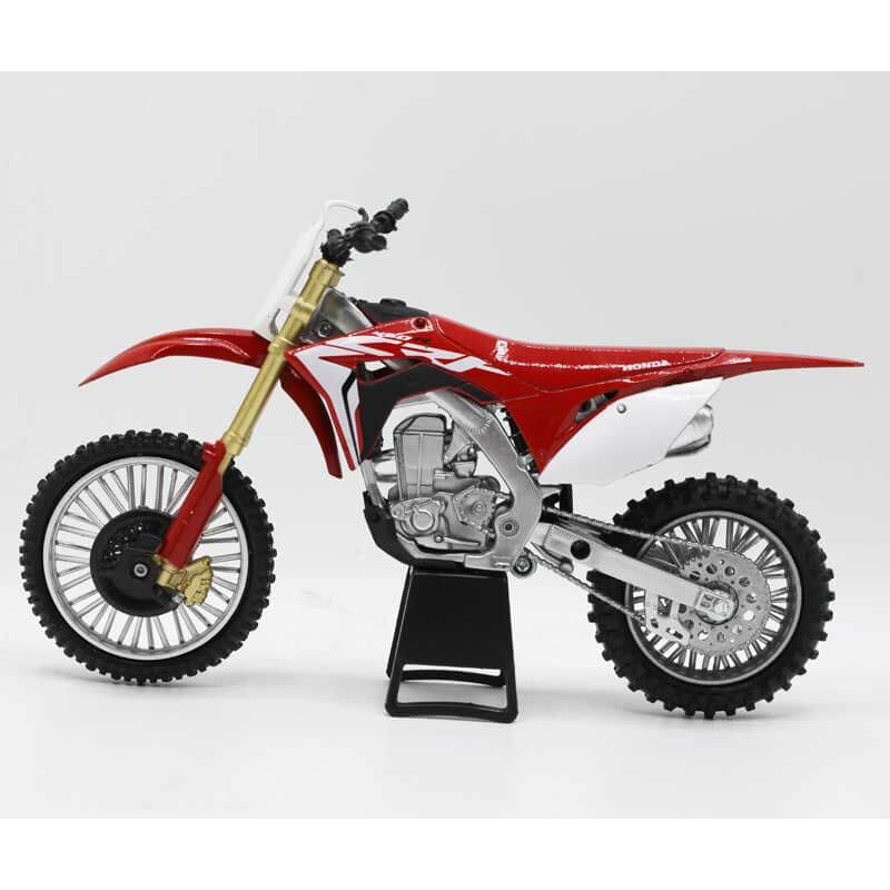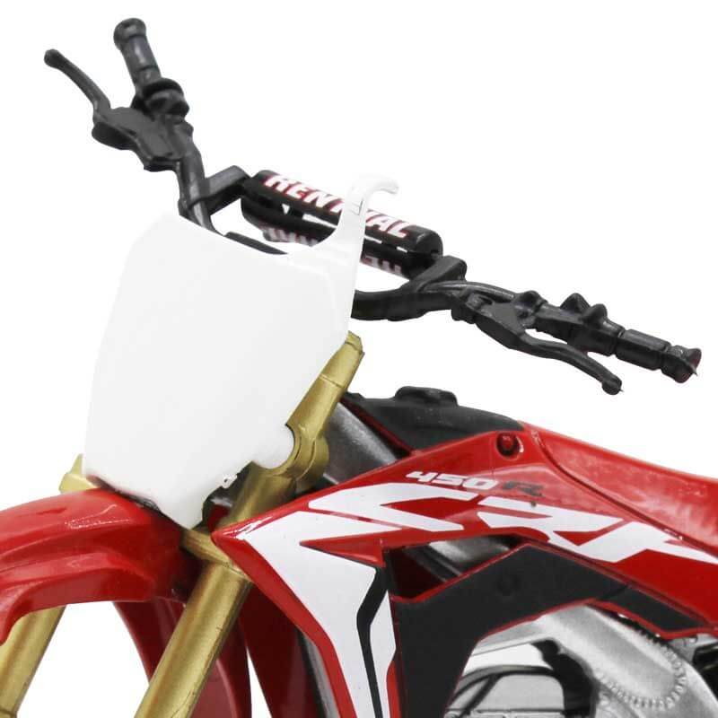 Motocross Honda CRF450R Lekaksmotorcykel som leksak till barn, en superfin lekakscross att leka med både inomhus och utomhus. Det är en Die-Cast motorcykel, i metall och plast. Motorcykeln köps så klart även för att ha den som samlarmodell i hyllan. Skala: 1:12. Längd: 18 cm.