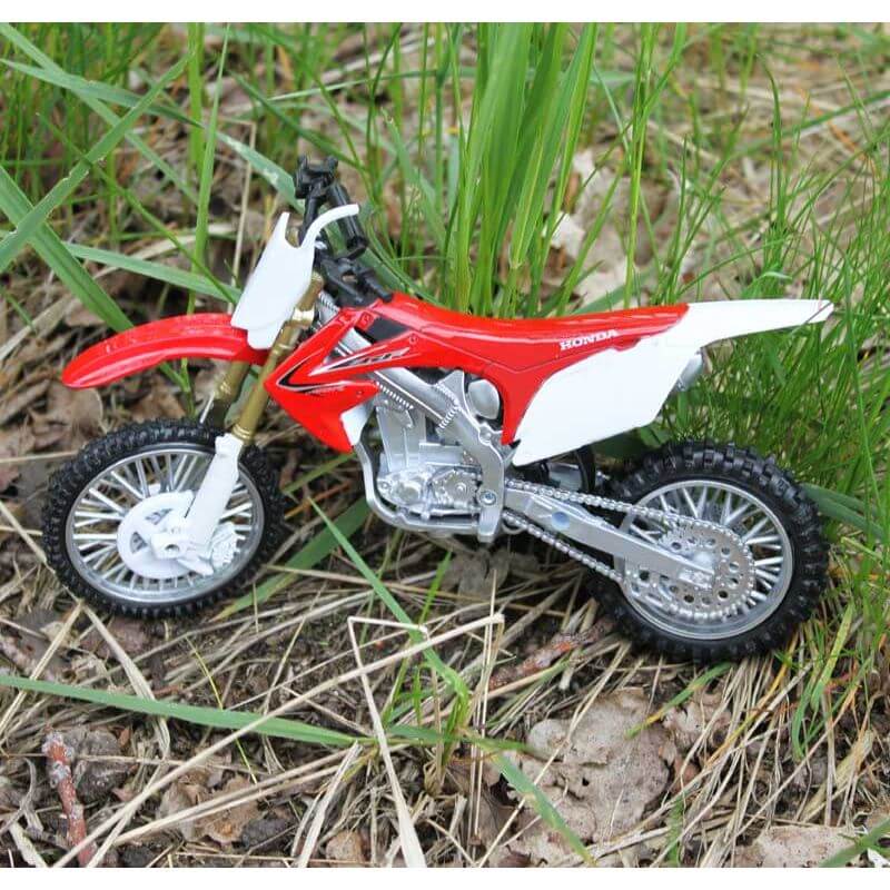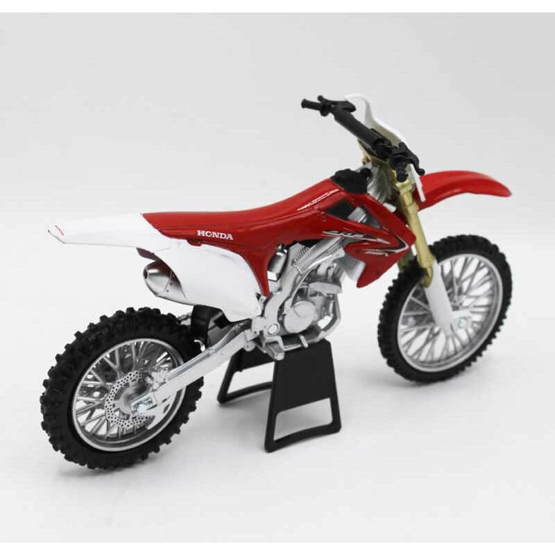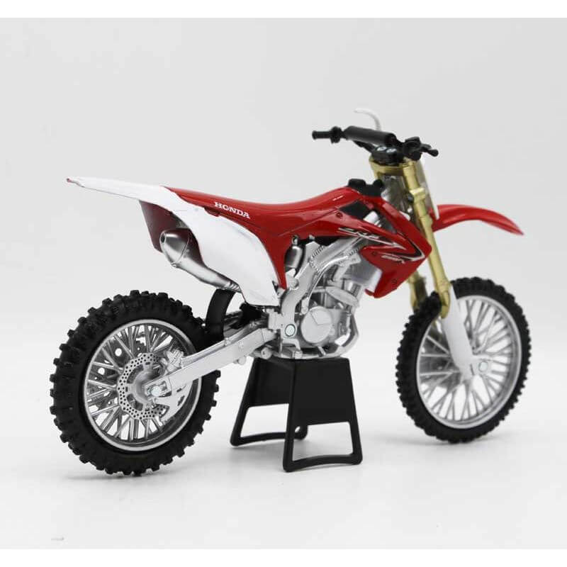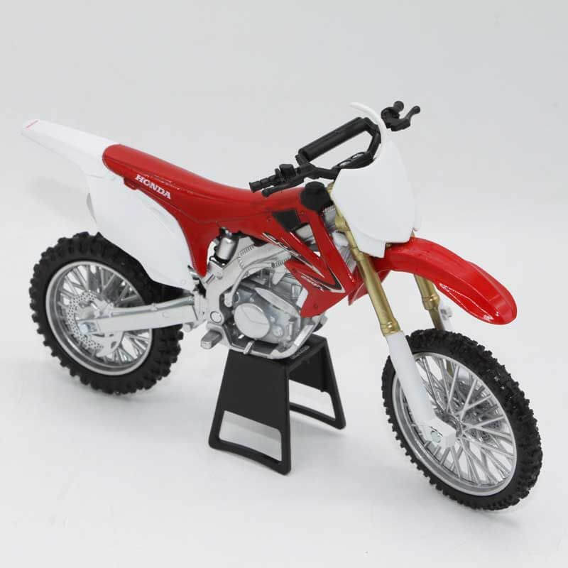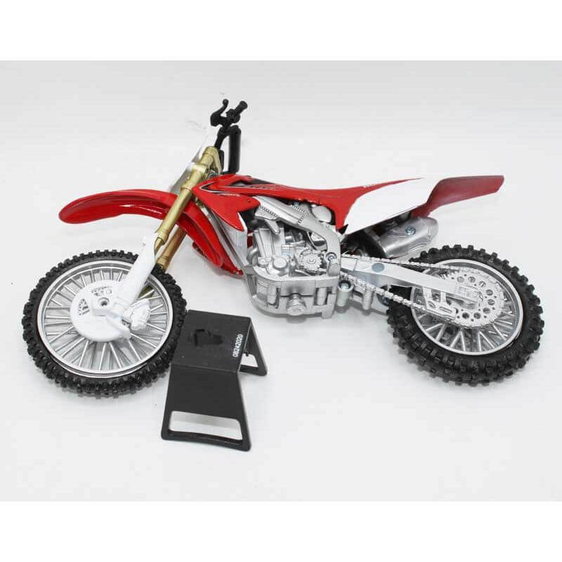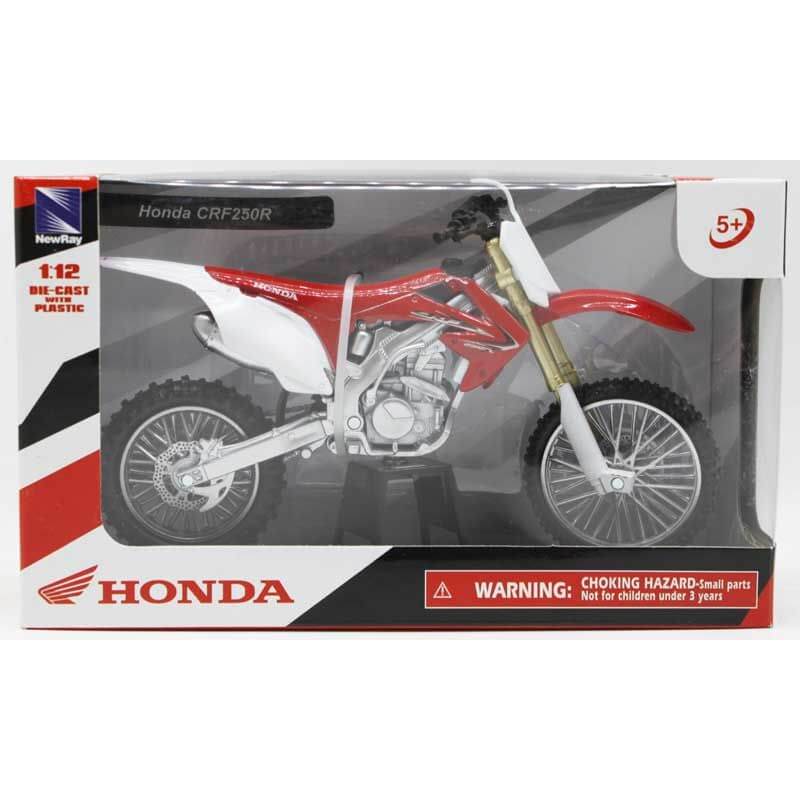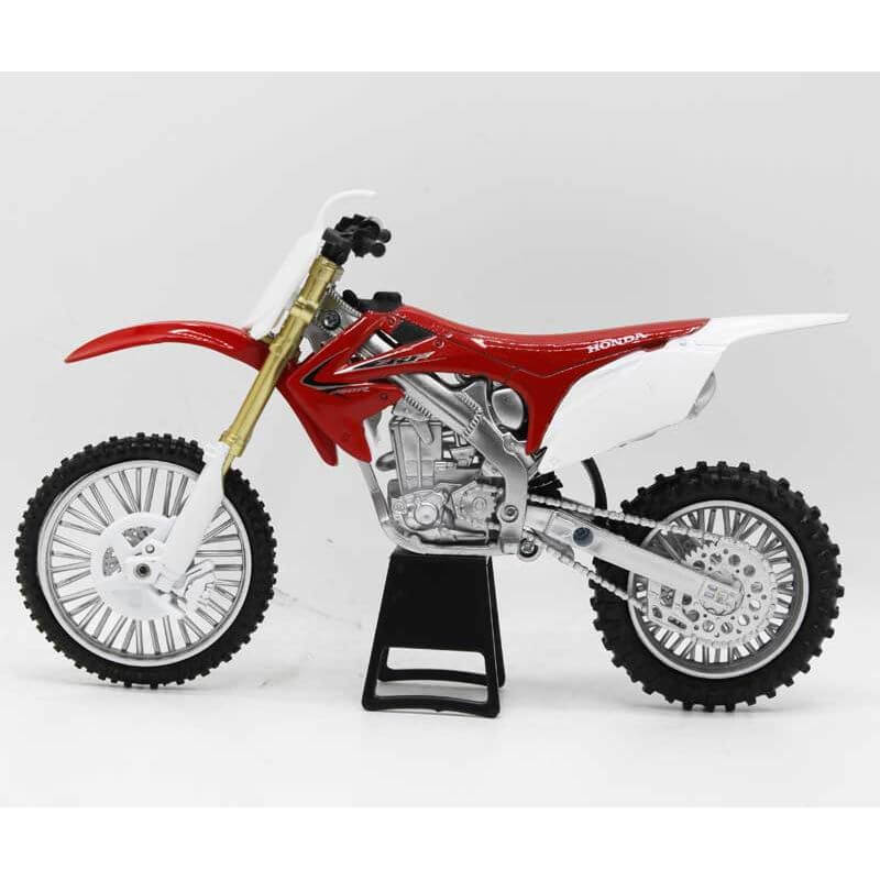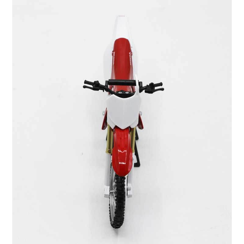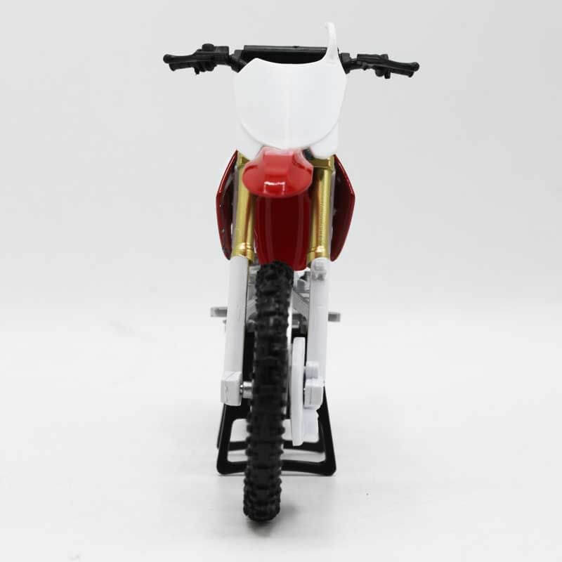 Motocross Honda CRF250R Lekaksmotorcykel som leksak till barn, en superfin lekakscross att leka med både inomhus och utomhus. Det är en Die-Cast motorcykel, i metall och plast. Motorcykeln köps så klart även för att ha den som samlarmodell i hyllan. Skala: 1:12. Längd: 18 cm.