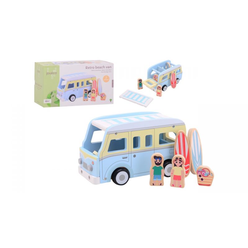Den klassiska minibussen kommer med söta träfigurer, surfbrädor och tillbehör som gör leken levande. Öppna bilen, lasta i passagerarna och kör mot stranden för sol, surf och picknick.