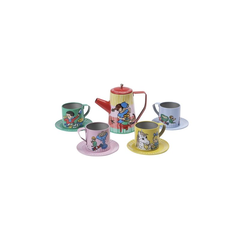 Nu kan barnet duka upp till tebjudning med Pippi och hennes vänner! Varje del i setet har en illustration på dom populära karaktärerna från Pippi. Setet innehåller en kanna med lock, 4 koppar och 4 fat.