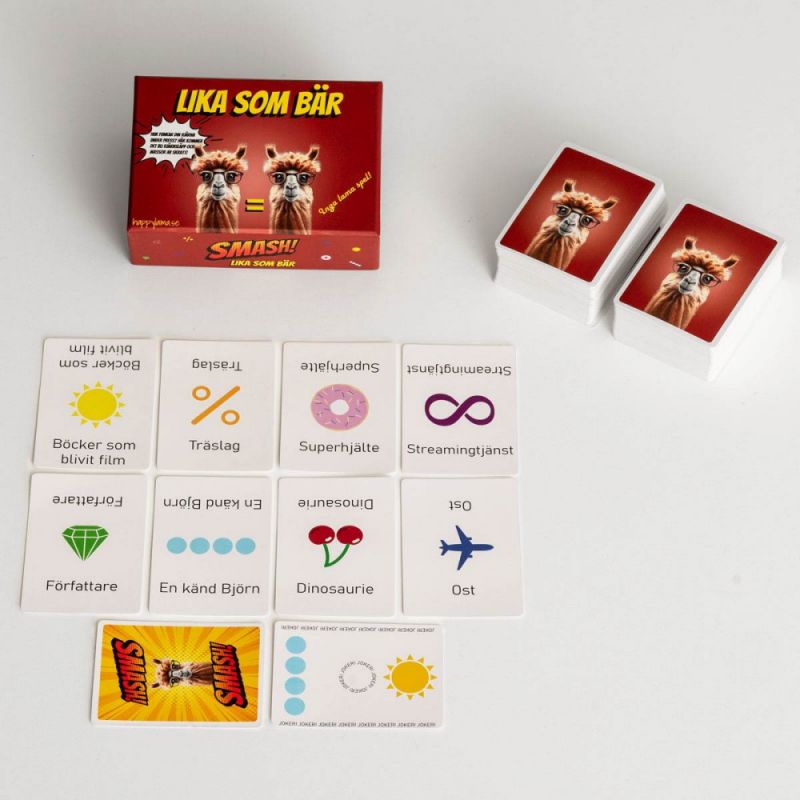 Meddela mig när produkten inkommer igen, klicka här.Här är spelet där det gäller att både vara snabbtänkt och att hänga med i svängarna! Håll utkik efter när någon får samma symbol som dig och var först med att säga ett svar på motspelarens kort. Den första som kommer på ett svar får behålla kortet som poäng. Men se upp, det kan även komma ett smash- eller jokerkort! Samla så mycket poäng du kan inom 15-30 min!