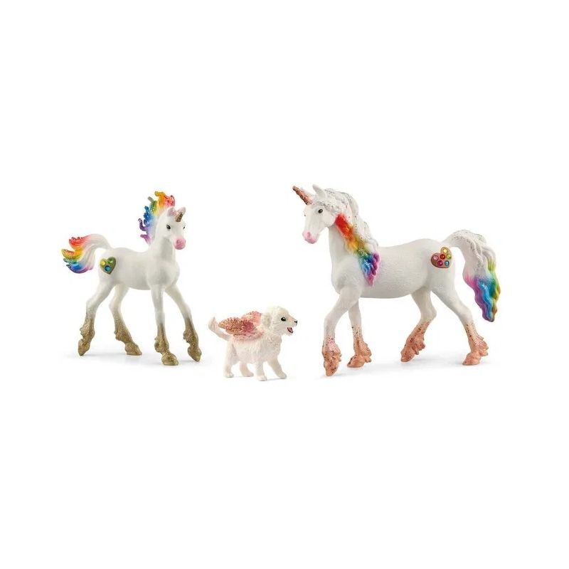 Magical Set sprakar av ren livsglädje och fantasi! Det bedårande enhörningsfölet galopperar lyckligt runt i hagen, medan dess yviga regnbågsman dansar i vinden.