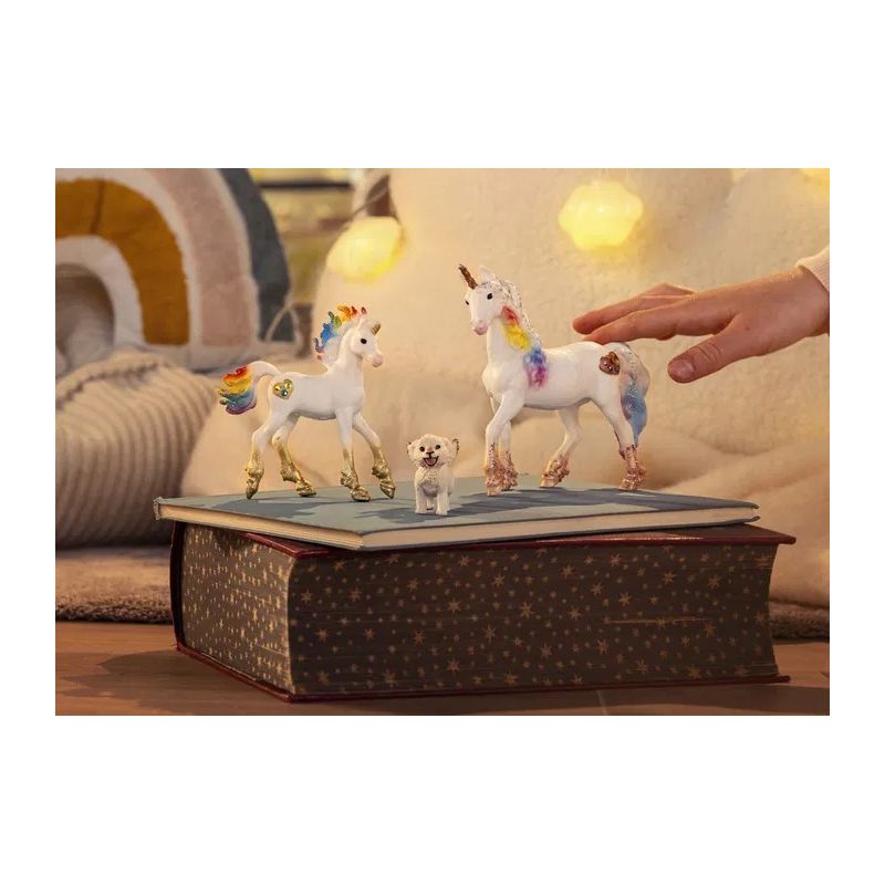 Det eleganta enhörningsstoet betraktar dem med värme i blicken. Hon älskar att se hur de två leker tillsammans och trippar då och då framåt med lätta steg för att hålla koll på sina spralliga vänner. Vem vet – kanske väntar de bara på att någon mer ska komma och vara med i deras magiska lek?