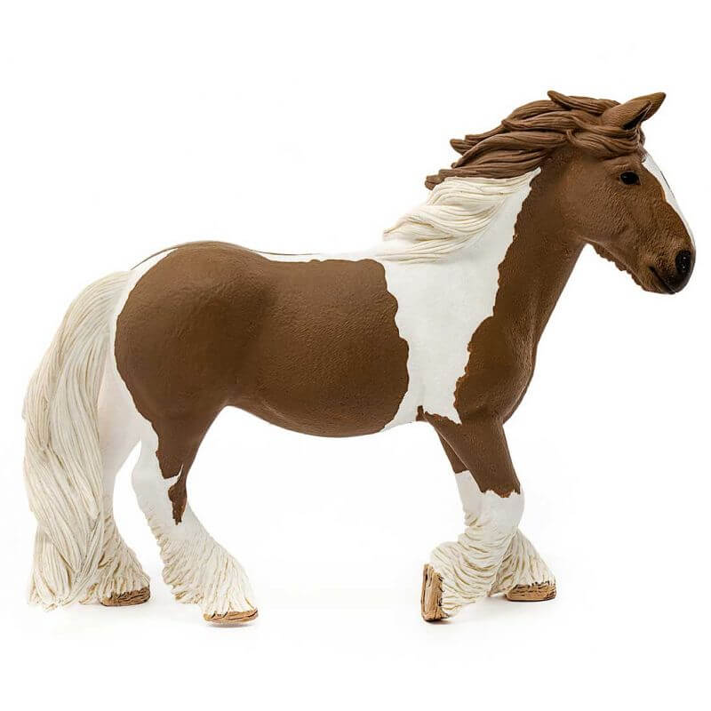 Schleich Tinker Sto 13773, ern vacker häst i brunt och vitt. Tinkerhästen har vacker fläckig päls, praktfull man, svallande svans och massor av hovskägg. Längd: 14 cm.