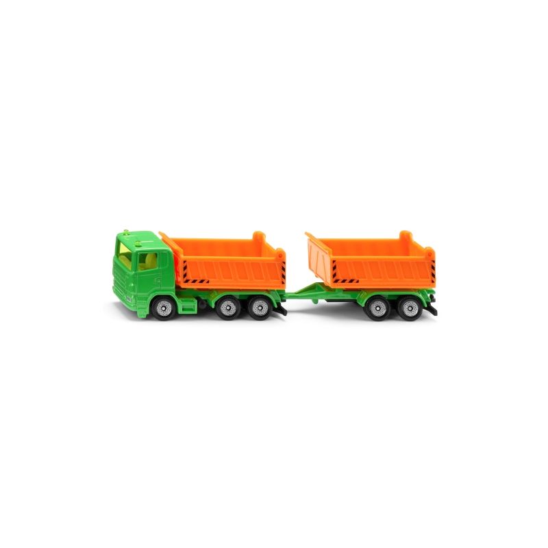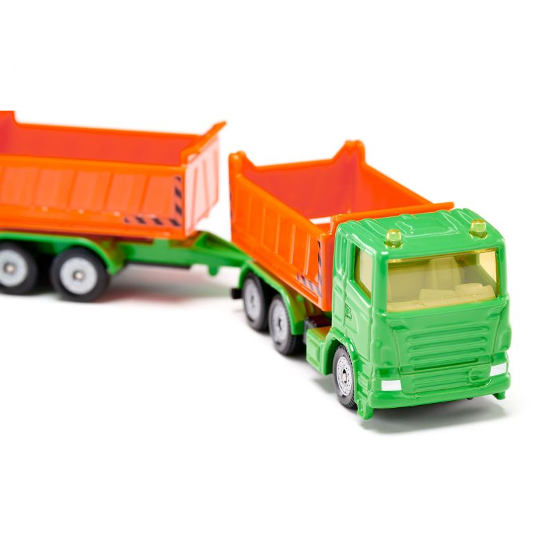 Siku Lastbil med två tippbara släp 1685, ett jättefint ekipage till lekrummet. Leksakslastbilar är ju något barnen alltid tycker är kul att leka med. Här kan man lasta massa roliga saker som tex. grus, betong, järnskrot, byggnadsmaterial med mera. Man kan koppla loss det bakre släpet om man vill det. Längd: 15 cm.