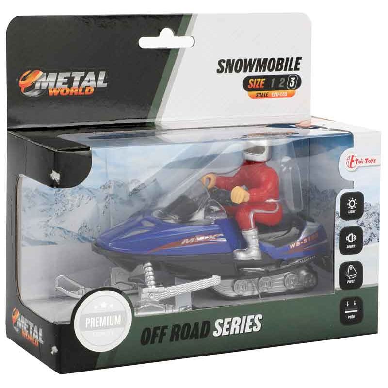 Snöskoter med lampa, ljud och förare, en superfin snöskoter där barnen kan ge sig ut på snön och köra. Lek med den utomhus året runt, roligast på vintern så klart :) eller lek inomhus. Den har en lampa och motorljud för en ännu roligare lek. Den finns i blått, gult, grönt och rött. Vilken färg man får blir en rolig överraskning.Längd: 13 cm.