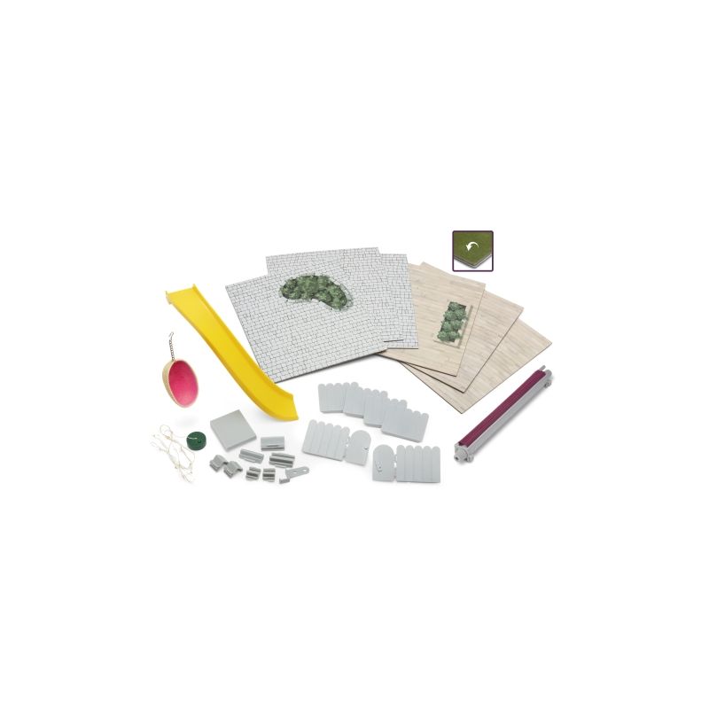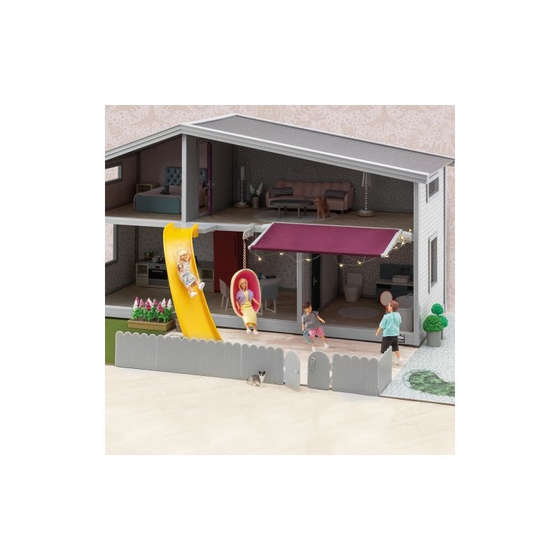 Det är en härlig sommarkväll i Lundbyvärlden. Det här setet har allt för att ge dockfamiljen en stor grönskande trädgård med gräs, stengång och fint staket med tillhörande grind.